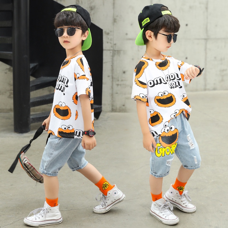 Thời Trang Trẻ Em > Trang phục bé trai > Bộ quần áo > Bộ quần áo bé trai💚 set áo phông thun cotton cộc tay và quần ngố jeans rách gấu GROVERS phong cách Hàn Quốc size 7-18 kg