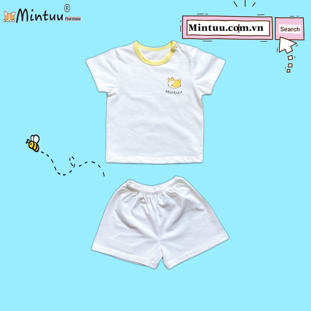 Giới thiệu Bộ quần áo sơ sinh tay ngắn, cài vai thương hiệu MINTUU FIRST CHOICE, chất liệu vải 100% cotton 4 chiều cho bé 0-2 tuổi
