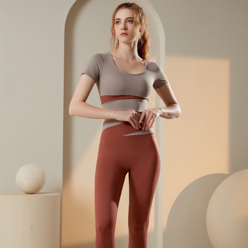 Bộ quần áo tập gym nữ không viền cổ vải co giãn 4 chiều có mút ngực - Set quần dài và áo croptop ngắn tay KENZI-79