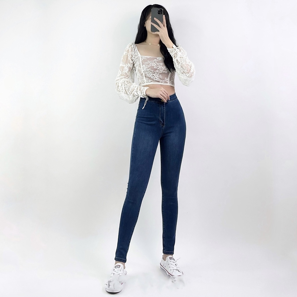 Giới thiệu Quần bò nữ lưng cao co giãn không túi CHERRY, Quần jean cạp cao bigsize skinny jeans dáng ôm trơn dài T021