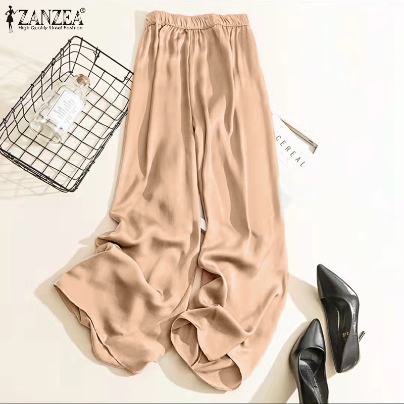 Giới thiệu Quần dài ống rộng ZANZEA lưng thun co giãn màu trơn thời trang thường ngày cho nữ