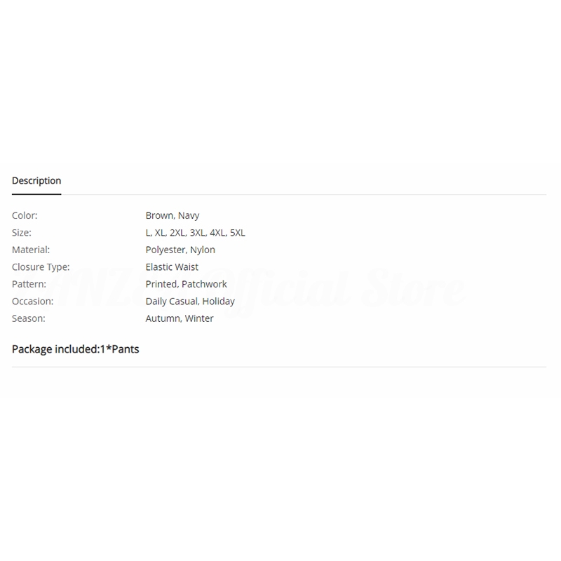 Màu sắc: Nâu, màu navy Size: L, XL, 2XL, 3XL, 4XL, 5XL Chất liệu: Polyester, Nylon Lưng quần: Thắt lưng đàn hồi Họa tiết : In, phối màu Các dịp phù hợp: Thường ngày, ngày lễ Mùa phù hợp: Mùa thu, mùa đông Gói hàng bao gồm: 1 * quần Lưu ý 1. Nếu bạn hài lòng với sản phẩm của chúng tôi, xin vui lòng cho chúng tôi đánh giá tích cực (năm sao). 2. Nếu bạn nhận được sản phẩm có vấn đề, xin hãy liên hệ với chúng tôi trước khi đưa ra đánh giá không tốt về sản phẩm. Cảm ơn bạn đã hiểu Nếu bạn nhận được một gói hàng bị lỗi, vui lòng liên hệ với chúng tôi ngay lập tức với hình ảnh hoặc video của mặt hàng Xuất xứ: Trung Quốc
