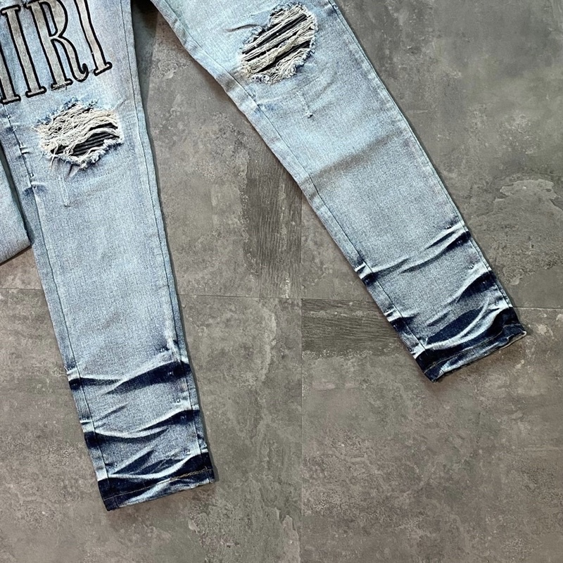 Giới thiệu Quần jean bò nam Amiri slimfit xanh khói vá da nhăn đen rách đùi gối dệt chữ ống xếp sóng cháy phố QJ101P