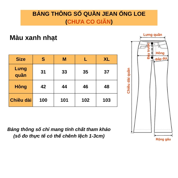 Quần jean bò ống loe màu xanh nhạt co giãn Bảng size mọi người có thể tham khảo thêm tại phần ảnh sản phẩm Bảng thông số chỉ mang tính chất tham khảo số đo thực tế có thể chênh lệch 1-3cm (form đo ở trạng thái nguyên bản chưa co giãn) LƯU Ý ĐỌC KỸ - Sản phẩm được sản xuất theo từng đợt nên màu sắc, vị trí rách xước và tem mác phụ kiện gắn kèm có đôi khi sẽ khác so với những lần mua trước, tuy nhiên về chất liệu vải hoàn toàn không thay đổi. - Màu sắc trên ảnh có thể chênh lệch 3-5% so với màu thật của sản phẩm tùy thuộc ánh sáng và màn hình hiển thị. - Với đặc trưng của chất liệu vải denim, đặc biệt là những chiếc quần jean màu tối, sản phẩm có thể bị ra màu trong vài lần giặt đầu, tuy nhiên điều này hoàn toàn không làm ảnh hưởng đến chất lượng của quần QUY ĐỊNH ĐỔI HÀNG: 1. Nếu mặc không vừa, không ưng MEISY sẽ hỗ trợ bạn đổi size hoặc đổi qua bất kỳ mẫu nào còn hàng tại shop (Lưu ý shop không hỗ trợ phí ship) 2. Shop chỉ chấp nhận trả hàng hoàn tiền trong trường hợp hàng lỗi hoặc không đúng mô tả, shop không chấp nhận trả hàng trong trường hợp khác. 3. Bạn vui lòng quay clip mở hàng, kiểm tra kĩ sản phẩm ngay sau khi nhận hàng, và liên hệ trực tiếp hoặc nhắn tin tới hotline để được bộ phận CSKH hỗ trợ sớm nhất. Đối với sản phẩm có vấn đề, nếu không có bằng chứng, shop không chấp nhận mọi khiếu nại. 4. Điều kiện đổi hàng * Sản phẩm trong tình trạng mới nguyên vẹn 100%. * Đổi trả trong vòng 3 ngày kể từ ngày bạn nhận hàng. #quanjean #bo #jean #boongloe #loe #quanjeanongloe #quancogian #bigsize #quanboongloecogian #loecogian