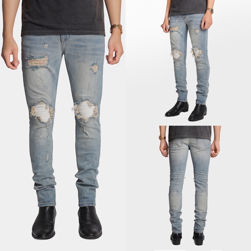 Giới thiệu Quần Jean Nam The Luyn Black Màu Xanh Vintage Rách Gối Tua Sợi Thêu Vá Da Bike Kem Trắng Phối Áo Thun Năng Động