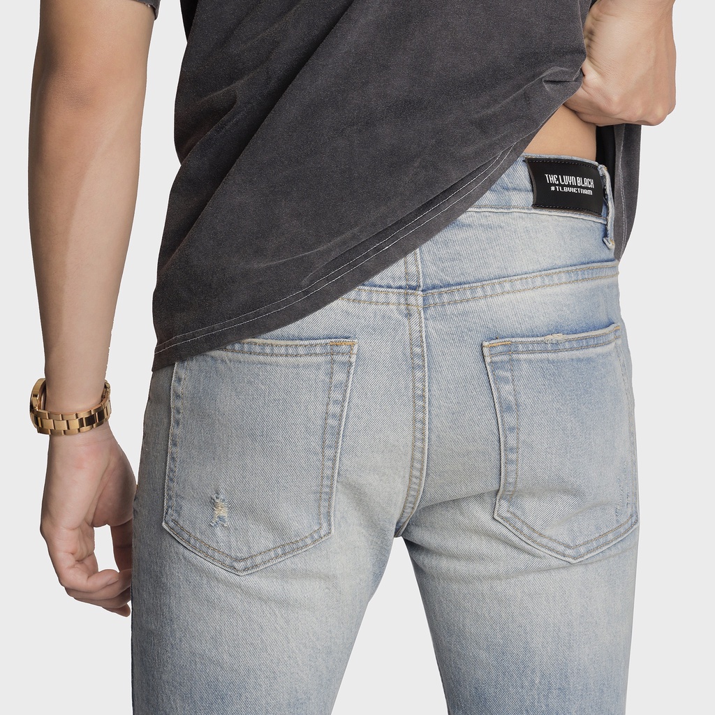 Quần Jean Nam The Luyn Black Màu Xanh Vintage Rách Gối Tua Sợi Thêu Da Bike Kem Trắng Phối Áo Thun Năng Động