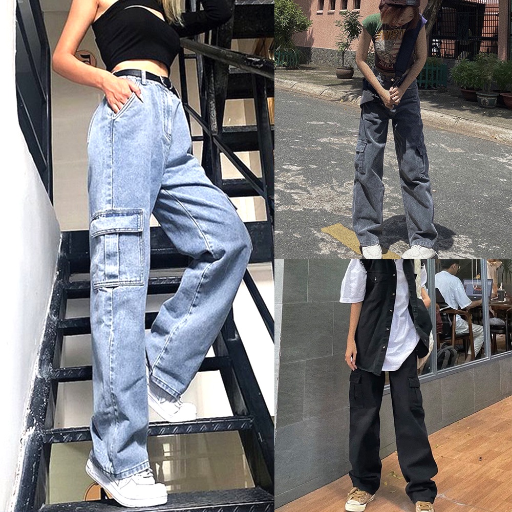 Giới thiệu Quần Jean túi hộp ống rộng hai bên, quần jeans ống đứng dáng suông nữ cạp cao màu xanh, đen hottrend 2022