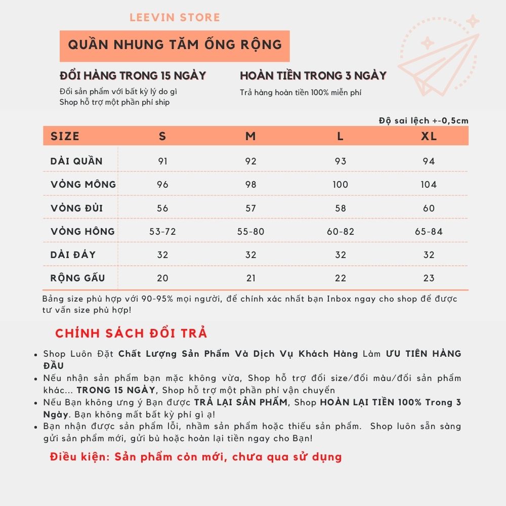 🌈 Hướng Dẫn Chọn Size Quần Ống Rộng Nữ Nhung Tăm Ulzzang Hàn Quốc - Size S: từ 38 - 45kg, Cao 1m48 - 1m58 - Size M: từ 46 - 50kg, Cao 1m59 - 1m64 - Size L: từ 51 - 56kg, Cao 1m65 - 1m68 - Size XL: từ 57 - 65kg, Cao 1m67 - 1m73 Ngoài cân nặng và chiều cao, Bạn tham khảo thêm các số đo quần trong phần hình ảnh để lựa size chuẩn nhất ạ. Hoặc Inbox ngay cho shop để được tư vấn chính xác hơn ạ!