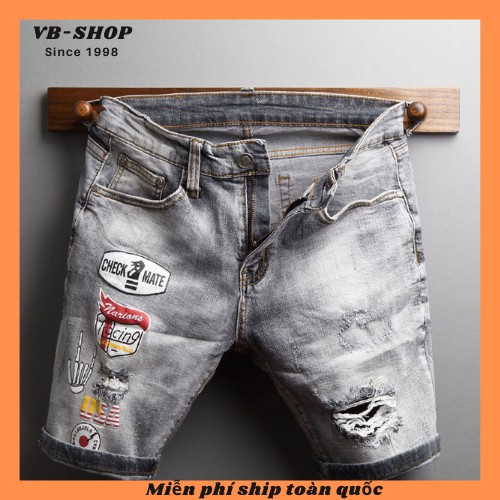 Giới thiệu Quần short jean nam xám tro rách nhẹ thêu nổi độc lạ, chất bò dày dặn co giãn form regular 1286