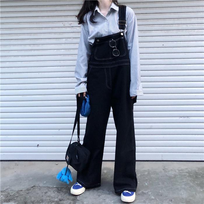 Giới thiệu Quần Yếm Denim Ống Rộng Màu Đen Ống Rộng Phong Cách Hàn Quốc Retro Thời Trang Cho Nữ Mới