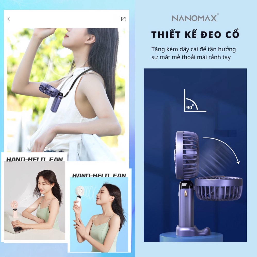 Quạt Mini Cầm Tay Nanomax N15 Gấp Gọn Để Bàn, Đeo Cổ, Sử Dụng Liên Tục Lên Đến 24 Tiếng, Pin Lithium Lõi Kép