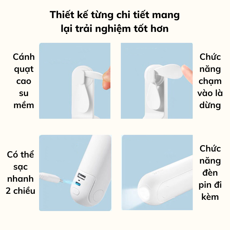 QUẠT MINI CẦM TAY 💔 Thông tin sản phẩm » Chất liệu: Nhựa ABS cao cấp, an toàn cho người sử dụng » Trọng lượng: 125g » Điện áp định mức: 5V » Công suất định mức: 1.5W » Độ ồn: <32 db » Dung lượng pin: 2000mAH » Tốc độ gió: 2 cấp độ