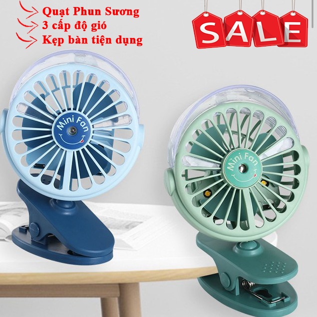 Quạt mini cầm tay, quạt mini tích điện phun sương kẹp bàn , 3 tốc độ gió, Pin 600mAh - Bảo hành 1 đổi 1