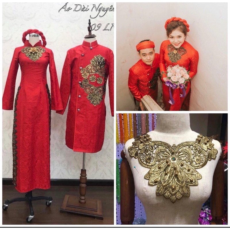 Tấm Cổ vàng đồng áo dài đã được kết hạt ngọc trai sẵn chỉ việc đính lên áo dài là ok luôn ạ có thể tỉa tách hoạ tiết hoặc để nguyên đều được nhé bạn màu sắc: vàng đồng kích thước : rộng 32cm dài 32cm Giá :35.000/1 tấm thích hợp trong ngành may mặc . --------------------