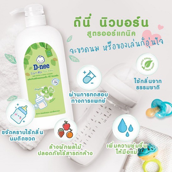 + Nước rửa bình sữa sản xuất tại Thái Lan bởi Dnee, nhãn hiệu chất lượng hàng đầu Thái Lan về bình sữa, núm vú, máy hút sữa và các sản phẩm chăm sóc làn da và đồ vệ sinh cho trẻ em. + Là dung dịch tẩy rửa, hạn chế nấm mốc cho bình sữa, núm vú, dụng cụ cai sữa, rau quả và đồ chơi trẻ em.. + Sản phẩm có thành phần từ các chất tương tự như bánh gatô và kem trái cây, nên rất an tâm khi sử dụng cho bé. + Là hoá hợp của các chất có khả năng tẩy rửa như este, glycoliqid hàm chứa bên trong trái cây, và tinh chất từ cam. + Là chất tẩy nhưng mềm mại cho da mẹ, đóng gói dạng chai có ống dẫn tiện dụng. + Dạng túi đựng bằng chất dễ phân hủy, tiện dụng và an toàn cho môi trường.