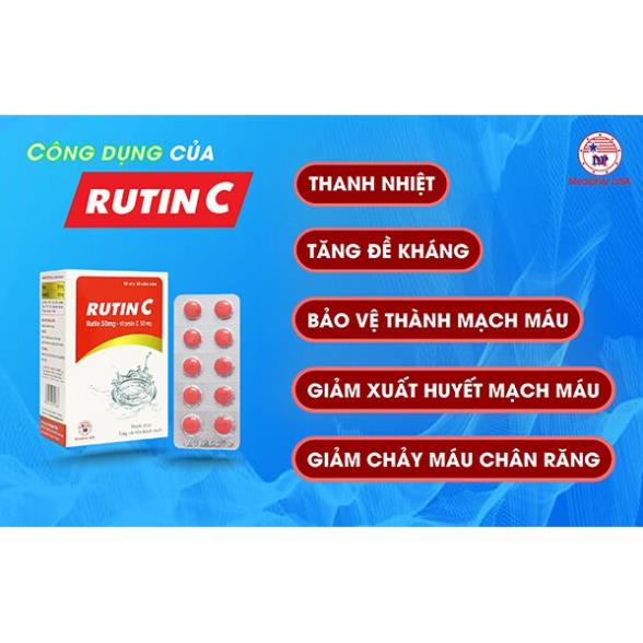 Công dụng viên uống Rutin C của Mediphar USA: • Bổ sung Rutin, Vitamin C giúp thanh nhiệt, giúp tăng tính đàn hồi và làm bền vững thành mạch máu. • Hỗ trợ giảm xuất huyết mạch máu, giảm chảy máu chân răng.