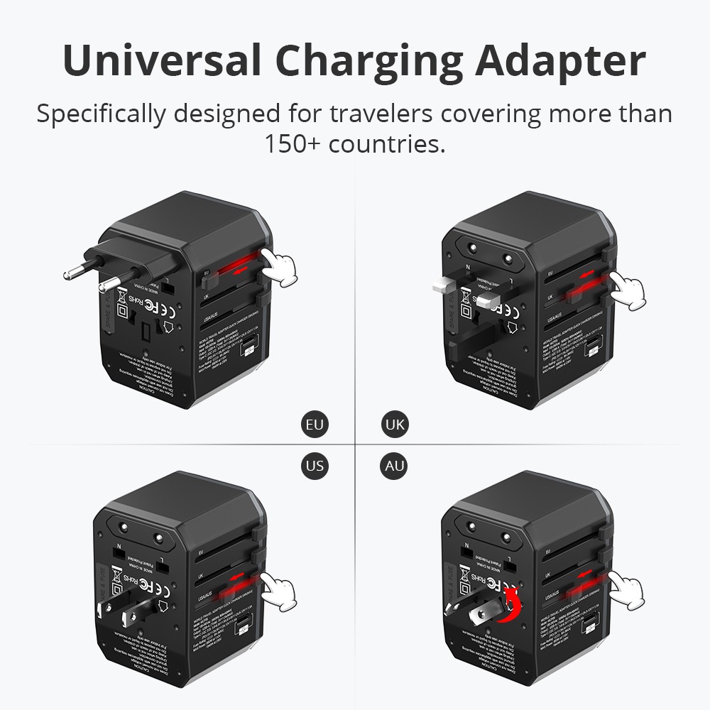 THÔNG TIN SẢN PHẨM - Model: WCP05 - Công nghệ: PD 3.0/QC 3.0/QC 2.0/Huawei FCP/Samsung AFC - Ổ cắm điện xoay chiều AC 100 - 240V, Tối đa 800mA. - Đầu ra DC: Tối đa 33W - Đầu ra (USB): USB-A: Cổng đơn: DC 5V, 2.4A Max; Cổng kép: Tổng 5V / 3A, Tối đa 15W. USB Type-C (PD 3.0 / QC 3.0): DC 5-6V / 3.0A, 6-9V / 2.0A, 9-12V / 1.5A, Tối đa 18W. - Giấy chứng nhận: FCC / CE / RoHS - :Kích thước 55 x 53 x 74mm / 2.16 x 2.08 x 2.91in (L x W x H) - Khối lượng tịnh: 155g / 5,43 oz - Đóng gói: 1 x Bộ chuyển đổi đa năng, 1 x Thẻ bảo hành, 1 x Hướng dẫn sử dụng Bộ sạc đa năng Được thiết kế đặc biệt cho khách du lịch trên hơn 150 quốc gia. Tương thích rộng hơn Hỗ trợ sạc nhanh cho tất cả các thiết bị USB. Tiêu chuẩn an toàn được chứng nhận Có sẵn cầu chì quá tải và tiêu chuẩn an toàn Cách sử dụng 1. Sử dụng: Chọn prong mong muốn, đẩy thanh trượt của nó cho đến khi bị khóa. 2. Đóng: Nhấn nút mở khóa và đẩy thanh trượt hoàn toàn trở lại vị trí bắt đầu. Khả năng tương thích - iPhone Xs / Max Xs / XR / X / 8/8 Plus / 7/7 Plus / SE / 6s Plus / 6s / 6 Plus / 6 / 5s / 5c / 5 - iPad Pro 12,9 inch / 11 inch / 10,5 inch, iPad air / mini full series - Samsung Galaxy S9 / S9 + / S8 / S8 + / S7 Edge / S6 Edge + / Note 9/8 / A9 - Huawei P20 Pro / P20 / P10 / P9 / P8 / Mate 10 Pro / 10/9/8 / Nexus 6P / nova - Google Pixel 3/3 XL / 2 / XL, Google Pixel, Google Nexus 6P / 5X - LG G5 / G6 / G7 / V20 / V30 / Nexus 5X - MacBook Air 13 inch / MacBook Pro 13 inch / MacBook 12 inch / Dell XPS 13/15 - HP Spectre 13,3 inch / Google Chromebook Pixel / Xiaomi Air / Pro - Xiaomi, Meizu, máy tính bảng, máy ảnh kỹ thuật số và nhiều hơn nữa Chú thích: 1. Ổ cắm điện xoay chiều không chuyển đổi điện áp. Đảm bảo các thiết bị được cấp nguồn AC của bạn như sau hỗ trợ 110-230V trên toàn thế giới để sử dụng ở nước ngoài. 2. Ổ cắm AC cung cấp công suất lên tới 880W ở AC 110 V và 1840W ở AC 230V. 3. Cổng USB-C không hỗ trợ sạc máy tính xách tay hoặc Nintendo Switch, vì vậy vui lòng sạc chúng qua ổ cắm AC bằng bộ sạc USB thích hợp. 4. Hỗ trợ sạc nhanh cho iPhone X / 8/8 Plus, iPhone Xs / Xs Max / XR khi được sử dụng với cáp Apple USB-C to Lightning gốc.