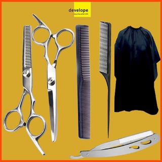 Combo Kéo cắt tóc và tỉa tóc tặng 2 cây lược, áo choàng cắt tóc và dao cạo râu - DEVELOPE