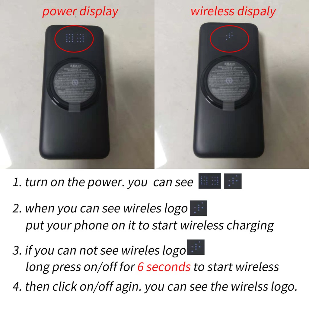 1. Dung lượng 【10000/20000 mAh】 2. Pin Li-polymer 3. Đầu vào: Micro 【2.1A tối đa 3A】 4. Đầu ra: Usb 1 【 2.1A】 Cáp Micro / Typc C / Lxxning 【2A】 Sạc không dây 【5v 1A】 5. Màn hình LED 6. Kích thước: 10000mAh 【15x7 x 1,6 cm】 20000mah 【15x7 x 3 cm】