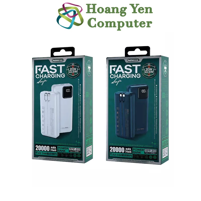 Giới thiệu Sạc Dự Phòng Remax RPP-513 20000Mah (Sạc Nhanh QC3.0, VOOC 2.0), Tích Hợp Cáp Sạc - BH 1 Năm - Hoàng Yến Computer