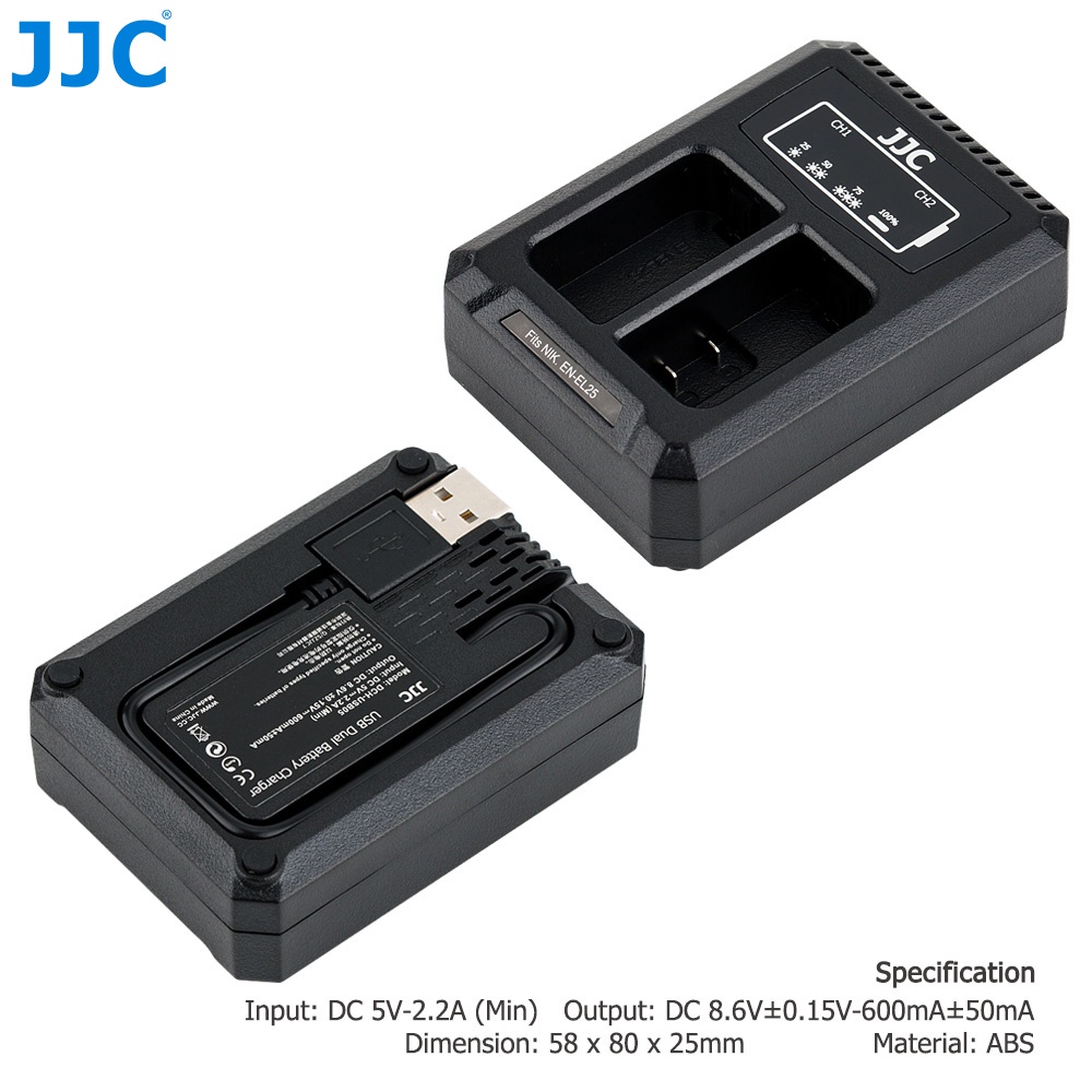 【Sự Chỉ rõ】 - Thương hiệu: JJC - Mẫu: DCH-ENEL25 / DCH-ENEL25UE - Chất liệu: ABS - Đầu vào: DC 5V-2.2A (Tối thiểu) - Đầu ra: DC 8.6V ± 0,15V⎓600ma ± 50mA - Thời gian sạc đầy: Khoảng 2,5 giờ - Kích thước sản phẩm: 80x58 x 25mm