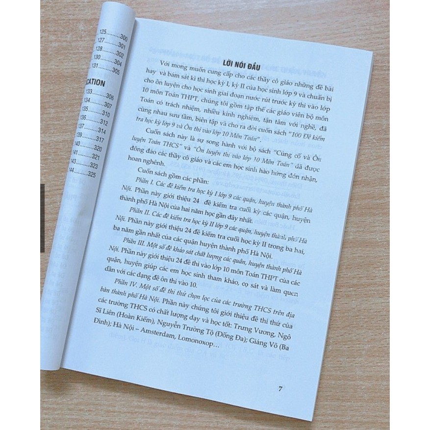 Với mong muốn cung cấp cho các thầy cô giáo những đề bài hay và bám sát kì thi học kỳ I, kỳ II của học sinh lớp 9 và chuẩn bị cho ôn luyện cho học sinh giai đoạn nước rút trước kỳ thi vào lớp 10 môn Toán THPT, Cuốn sách này là sự song hành với bộ sách “Củng cố và Ôn luyện Toán THCS” và “Ôn luyện thi vào lớp 10 Môn Toán” đã được đông đảo các thầy cô giáo và các em học sinh hào hứng đón nhận, hoan nghênh. Cuốn sách gồm các phần: - Phần I. Các đề kiểm tra học kỳ I lớp 9 các quận, huyện thành phố Hà Nội. Phần này giới thiệu 24 đề kiểm tra cuối kỳ các quận, huyện thành phố Hà Nội của hai năm học gần nhất là 2016 - 2017 và 2017 - 2018. - Phần II. Các đề kiểm tra học kỳ II lớp 9 các quận, huyện thành phố Hà Nội. Cũng giống như phần I, Phần này giới thiệu 24 đề kiểm tra cuối học kỳ II trong ba hai, ba năm gần nhất của các quận huyện thành phố Hà Nội. - Phần III. Một số đề khảo sát chất lượng các quân, huyện thành phố Hà Nội. Phần này giới thiệu 24 đề thi vào lớp 10 môn Toán THPT của các quận, huyện. - Phần IV. Một số đề thi thử chọn lọc của các trường THCS trên địa bàn thành phố Hà Nội. Chúng tôi chọn lọc đề thi của một số trường THCS có chất lượng tốt như: Trưng Vương, Ngô Sĩ Liên, Amsterdam, Nguyễn Trường Tộ, Giảng Võ, Archimedes Academy, Lomonoxop, Lương Thế Vinh, Nguyễn Tất Thành, Nguyễn Du… - Phần V. Một số đề thi thử chọn lọc do các thầy cô trong đội ngũ Fermat biện soạn dựa trên form chuẩn của Sở Giáo dục đào tạo Hà Nội. LƯU Ý: Tất cả các đề chỉ có hướng dẫn giải và đáp số nhằm giúp học sinh phát triển năng lực tự học, nỗ lực trong học tập. Chúng tôi hi vọng đây thực sự sẽ là tài liệu quí giá hỗ trợ học sinh lớp 9 trong kì thi học kì I, II và kì thi vào 10.