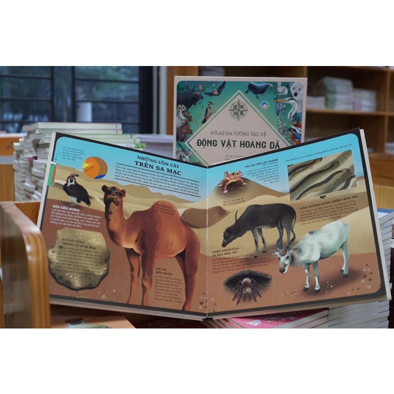 Hãy cùng mở cuốn sách Atlas đa tương tác về động vật hoang dã để bước vào một hành trình thú vị: Hành trình khám phá 7 môi trường sống đặc trưng của các loài động vật, tìm hiểu cách chúng sinh tồn và những thông tin hữu ích. Độc giả sẽ băng qua những rừng mưa nhiệt đới rậm rạp, dạo bước trên cồn cát bỏng cháy, ngụp lặn dưới sóng biển hay lướt qua hai miền địa cực… để tìm hiểu về cách thức sinh tồn của hơn 100 loài động vật đặc trưng nhất trên Trái Đất. Sẽ chẳng ngạc nhiên nếu hành trình này mất nhiều thời gian hơn bạn dự tính. Bởi có quá nhiều điều thú vị sẽ giữ chân bạn lại lâu hơn, để tìm hiểu, để khám phá và yêu hơn những sinh vật trên Trái Đất này. Điềm đặc biệt không thể không nhắc đến ở cuốn sách này là kết cấu đa tương tác độc đáo. Với những miếng lật mở, bánh xe xoay tròn, mô hình pop-up 3D… thế giới của các loài động vật hiện lên vô cùng chân thực, hấp dẫn. Đó cũng chính là cách Atlas đa tương tác về động vật hoang dã lôi cuốn các độc giả nhí vào hành trình khám phá thế giới động vật đầy màu sắc. Thông qua những thao tác lật mở, tương tác với sách, trẻ cũng hoàn thiện vận động tinh, giúp cho việc đọc sách và thu nạp kiến thức trở nên hấp dẫn hơn bao giờ hết.