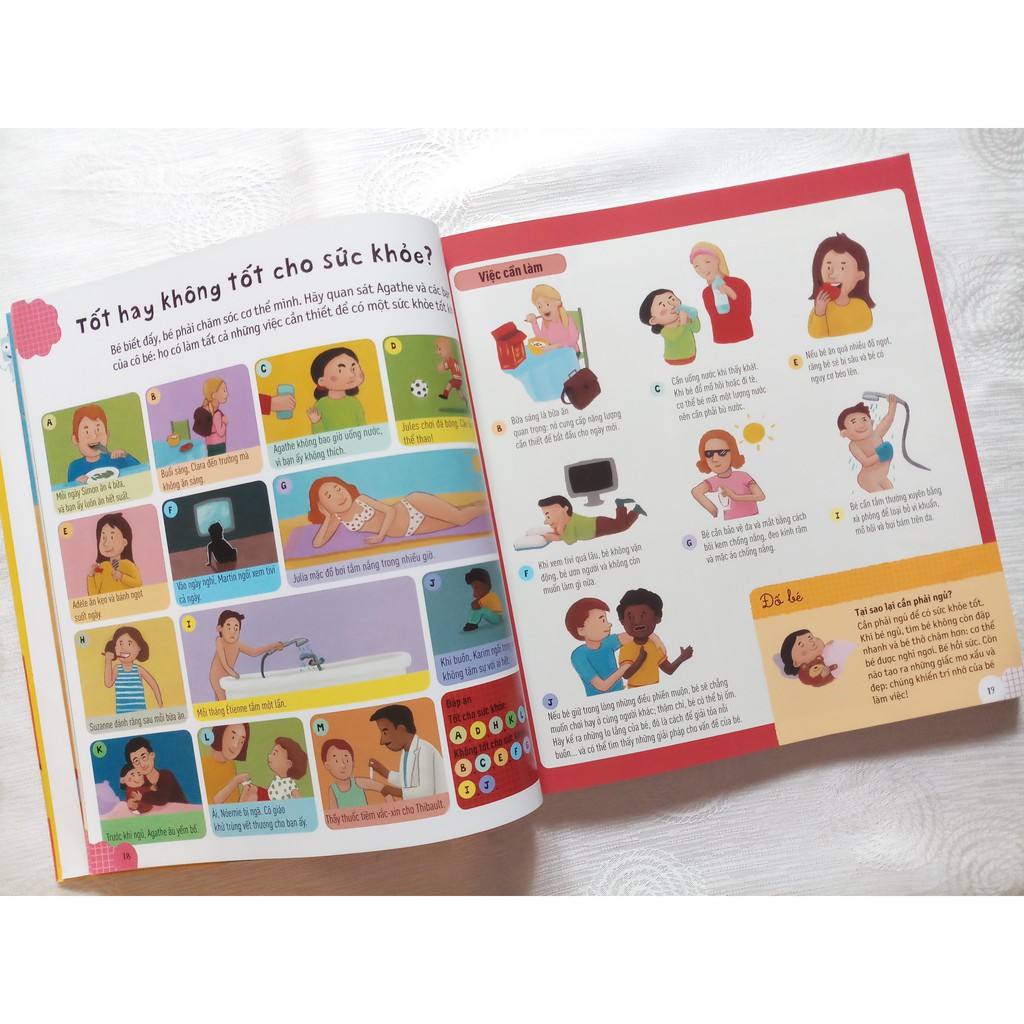 Nội dung sách được thiết kế rất gần gũi với các bé, mỗi câu hỏi đi kèm lời giải thích rõ ràng và dễ hiểu. Kết hợp với phần hình ảnh minh họa màu sắc tươi sáng, sinh động, gắn với bảy chủ đề, phụ huynh và các con dễ dàng tưởng tượng, tăng khả năng đọc hiểu, phát triển tư duy và ngôn ngữ rõ rệt.