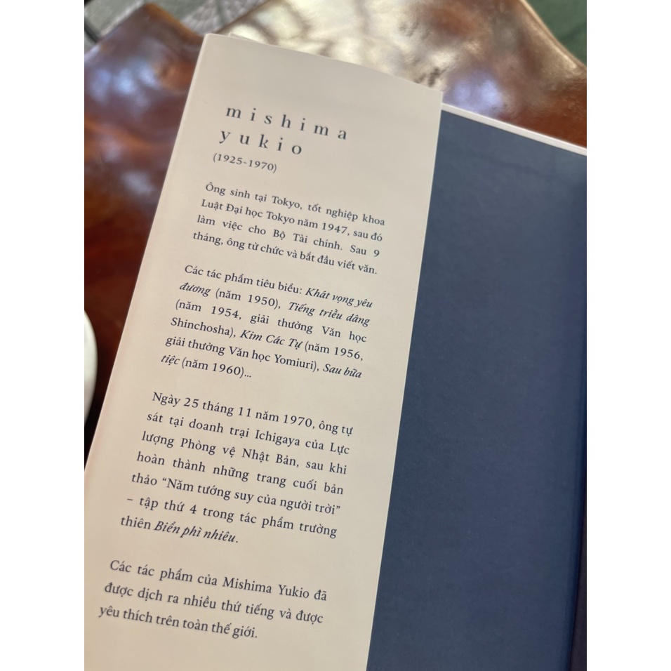 Yukio Mishima (1925-1970) tên thật là Kimitake Hiraoka, là nhà văn hiện đại rất nổi tiếng của Nhật Bản. Ông từng hai lần nằm trong danh sách đề cử giải Nobel của Viện Hàn lâm Thụy Điển, một lần vào năm 1965 cùng với Junichiro Tanizaki và Mikhail Sholokhov; lần thứ hai là năm 1967 với Miguel Angel Asturias, Samuel Beckett và Andre Malraux. Tuy không được trao tặng giải Nobel nhưng đương thời sách của ông được xếp vào hàng best-seller của Nhật Bản, được dịch ra rất nhiều thứ tiếng trên thế giới, vượt xa cả hai nhà văn đoạt giải Nobel của xứ Phù Tang là Yasunari Kawabata (Nobel 1968) và Oe Kenzaburo (Nobel 1994) về số lượng phát hành.