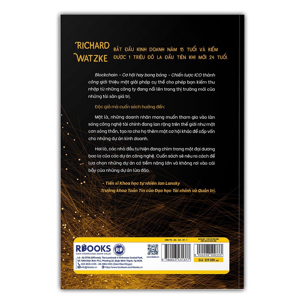 Blockchain - Cơ Hội Hay Bong Bóng - Chiến Lược Ico Thành Công Cuốn sách hướng dẫn của tác giả Richard Watzke hướng đến hai nhóm độc giả chính. Nhóm thứ nhất là các nhà khởi nghiệp: những người muốn cưỡi trên làn sóng tiền mã hóa đang lan rộng ra khắp thế giới như một cơn sóng thần. Cuốn sách sẽ đem đến cho họ cơ hội có được vốn đầu tư cho các dự án kinh doanh của mình. Nhóm độc giả thứ hai là các nhà đầu tư: những người đang chìm trong đại dương của các dự án mã hóa được gọi là ICO. Cuốn sách sẽ cung cấp phương pháp để giúp họ lựa chọn các dự án có tiềm năng cao và không bị mắc vào cái bẫy của các dự án lừa đảo. Trong cuốn cẩm nang này, tác giả kể lại kinh nghiệm cấp vốn cho các dự án kinh doanh trong thế giới thực của mình. Vì bị ràng buộc bởi các quy định, các ngân hàng lo ngại về việc cung cấp tiền cho những dự án không phù hợp với các mô h...