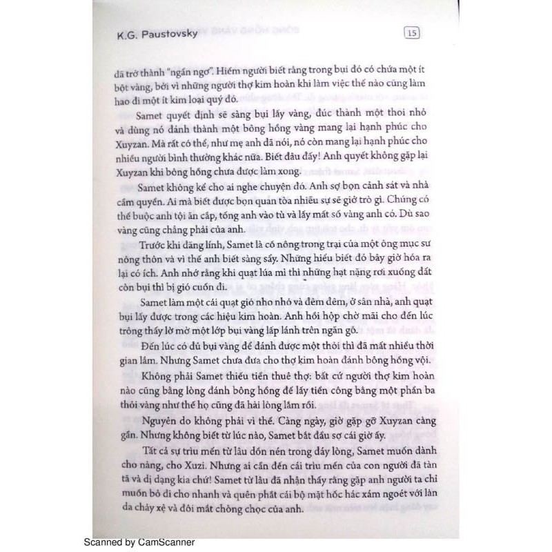 Giăng Samet là một anh thợ quét rác tại thành Pari. Anh ta sống trong một túp lều ở ngoại thành. Trước đây anh ta đã đừng đi lính trong trận chiến ở Mexico. Sau đó anh ta gặp sốt rét rồi được gửi về nước. Viên chỉ huy đã gửi nhờ Samet đưa đứa con gái lên 8 tuổi tên là Xuyzan về Pháp, gửi cho người bác. Trên đường trở về Pháp, anh ta đã kể lại cho cô bé Xuyzan nghe về cuộc đời mình với những mâu kí ức vụ vặt. Trong đó có câu chuyện về bông hồng vàng mà anh đã từng nhìn thấy trong nhà một bà lão dân chai. Người ta tin rằng ai có được bông hồng vàng thì sẽ có được hạnh phúc. Rồi Xuyzan dược trao lại cho người bác. Năm tháng đi qua, Samet sống trong cảnh thiếu thốn đơn diệu làm hết nghề này đến nghề khác rồi trở thành người thợ quét rác thành Pari. Một ngày anh gặp lại Xuyzan, cô gái ước có ai đó tặng cô bông hồng vàng. Vì thế Samet đã đi thu gom những hạt bụi có chứa bột vàng ở các xưởng kim hoàn mang về để đúc thành 1 thoi nhỏ và dùng nó để đánh 1 bông hồng vàng mang lại hạnh phúc cho Xuyzan. Cuối cùng khi đánh xong bông hồng vàng, đó là một bông hồng tinh xảo, cùng trên một cành, bên cạnh bông hoa có 1 nụ hồng bé nhỏ và nhọn hoắt, thì Samet mới biết Xuyzan đã rời Pari đi Mĩ. Samet ốm yếu và qua đời. Người ta lấy ở dưới cái gối của anh ra một bông hồng vàng bọc trong cái nơ nhàu nát màu xanh, từ chiếc nơ xông lên mùi chuột.Sau này bông hồng vàng đó được bán lại cho 1 nhà văn. “Bông hồng vàng của Samet!. Đối với tôi phần nào là hình tượng tương lai của hoạt động sáng tạo của chúng ta. Thật là lạ lung khi chẳng có ai chịu bỏ sức lao động của mình ra nghiên cứu xem từ những hạt bụi quý ấy đã phát sinh nguồn NXB Văn Học sinh động như thế nào”.