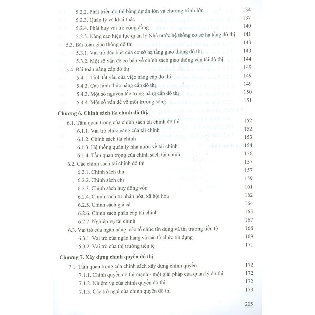 Chương 1: Đô thị, đô thị hóa và vai trò của Nhà nước. Chương 2: Tăng trưởng đô thị, môi trường và quy hoạch. Chương 3: Chính sách đất đai đô thị. Chương 4: Chính sách về nhà ở. Chương 5: Chính sách về cơ sở hạ tầng và dịch vụ đô thị. Chương 6: Chính sách tài chính đô thị. Chương 7: Xây dựng chính quyền đô thị."