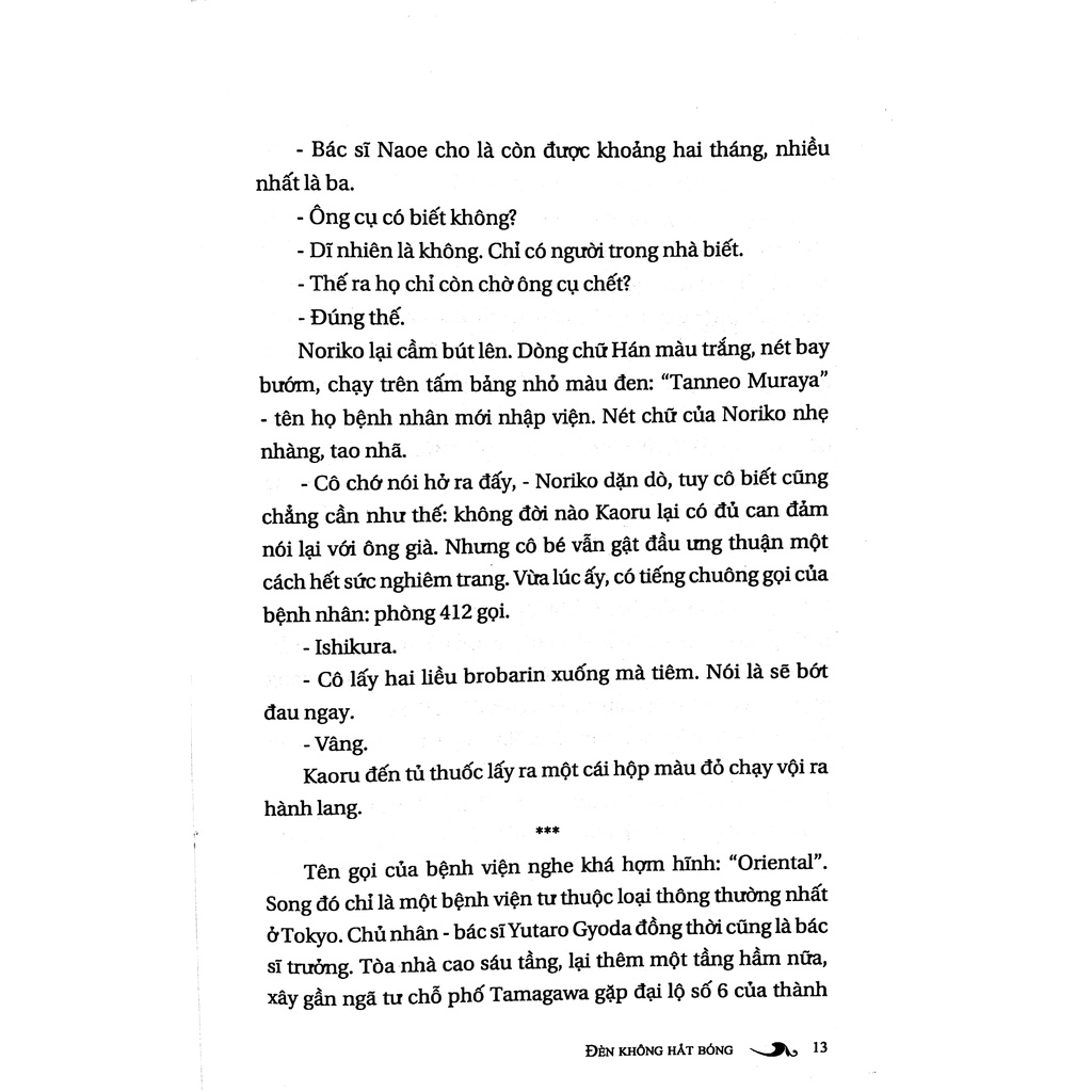 Đèn không hắt bóng là tác phẩm văn học nổi tiếng nhất của Wanatabe Dzunichi – vừa là nhà văn vừa là Tiến sĩ Y khoa. Nhiều thế hệ thuộc lòng tiểu thuyết độc đáo này, bởi không khí xám bạc dịu dàng đặc trưng của Nhật Bản, bởi sự dằn vặt muôn thuở trước sự sống và cái chết, sự song hành giữa tình yêu và cô độc. Tinh hoa văn học của nhân loại nào cũng cần được khám phá và tái khám phá. Mỗi tác phẩm lớn là một sự kỳ diệu và mỗi lần ta tìm đến là thực hiện những cuộc phiêu lưu hoan lạc. Đến với tiểu thuyết Đèn Không Hắt Bóng là chúng ta đang bước vào cánh cửa thứ nhất của Tủ sách tinh hoa văn học - cánh cửa với những tác phẩm được dịch trọn vẹn và giới thiệu cả tác giả lẫn tác phẩm trong bối cảnh văn hoá với những đặc điểm thiết yếu - cánh cửa Kiệt Tác. Tiểu thuyết Đèn Không Hắt Bóng là tác phẩm nổi tiếng nhất của Watanabe Dzunuchi được viết trong giai đoạn khoảng năm 1971. Đèn Không Hắt Bóng không đơn thuần kể về đời sống bệnh viện. Nhìn ở góc độ khác, nó là câu chuyện tình yêu lạnh lùng, bí ẩn và đau đớn. Mối quan hệ giữa Noriko và bác sĩ Naoê phải chăng là tình yêu một chiều? Đứng bên cạnh vị bác sĩ tài hoa, hình ảnh của Noriko khá lặng lẽ. Yêu Naoê, tự nguyện gắn bó với anh, cô vẫn phải chứng kiến hàng loạt mối quan hệ bất thường của Naoê với những phụ nữ khác, từ vợ và con gái của bác sĩ viện trưởng, cô gái quán bar, cho đến nàng ca sĩ ngôi sao… Nhưng đau khổ hơn hết, cô nhận ra Naoê là một pháo đài riêng, không cho cô thâm nhập, ngay cả những giây phút gần gũi nhất cả về thân xác lẫn tình cảm. Chỉ đến khi Naoê mất đi, bức màn bí mật mới được vén lên. Giữa bao nhiêu phụ nữ vây quanh, Naoê chỉ yêu một mình Noriko. Cô chính là mảnh gương cuộc đời để anh soi vào, là chỗ bấu víu duy nhất trong những cơn đau đớn tuyệt vọng vì cái chết gần kề… Nhưng vì kiêu hãnh và xót thương, anh không bao giờ phơi bày sự thật với cô. Tình yêu bền bỉ của Noriko đã được đền đáp, dù muộn mằn…
