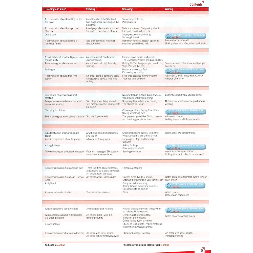Nội dung : * Thúc đẩy người học tăng cường tương tác trong quá trình học. * Cung cấp hệ thống quản lý quá trình học tập. * Tạo ra các hoạt động thực hành phong phú. * Hỗ trợ người học tiếp cận toàn diện các kỹ năng vận dụng ngôn ngữ. Nội dung gồm có: Unit 1. People Unit 2. Work and study Unit 3. Daily life Unit 4. Food Unit 5. Places Unit 6. Family Unit 7. Journeys Unit 8. Fit and healthy Unit 9. Clothes and shopping Unit 10. Communication Unit 11. Entertainment Unit 12. Travel