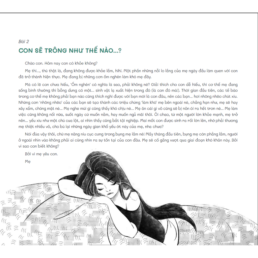 Tập sách tranh này bao gồm 30 bài viết nhỏ, mà cô Quỳnh Hương soạn ra để mẹ bầu bạn với bé yêu từ những giây phút đầu tiên nhận biết sự có mặt của con, cho đến khi con tròn một tuổi. Một giai đoạn cực kỳ quan trọng, ảnh hưởng đến tính cách và cuộc sống của con sau này. Các bài viết này sẽ được chính cô Quỳnh Hương thể hiện qua giọng đọc, trên nền âm nhạc của anh Nguyễn Lê Gia Toại con trai cô, để mẹ mở cho bé trong bụng nghe thường xuyên cho quen thuộc luôn nè. Bên cạnh đó, phần chữ in to và tranh vẽ thật dễ thương của chị họa sĩ KLBC cũng dành cho mẹ mở ra tập đọc dần cho bé quen nghe giọng mẹ... Thông qua đôi mắt của mẹ ngắm tranh, bé cũng sẽ tập ‘ngắm’ ngay từ trong bụng mẹ... Rồi sau khi chào đời, những bản audio cô Quỳnh Hương đọc sẽ tiếp tục làm bạn với bé ngay từ những tháng ngày đầu tiên. Bé nghe quen rồi, bé sẽ dễ ngủ, ít sợ hãi, thích nghi với đời sống mới bên ngoài bụng mẹ nhanh hơn, bé nhé!