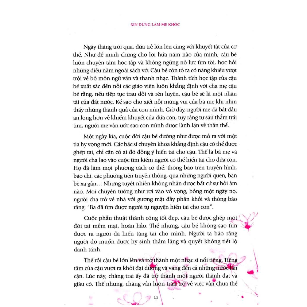 Xin đừng làm mẹ khóc là những câu chuyện giản dị mà đầy ý nghĩa, sâu sắc về người mẹ, về tình mẹ con - một tình yêu thương vô điều kiện và không gì có thể sánh bằng. Trong những trang sách này, bạn sẽ tìm lại được và nhận ra những phút giây đồng cảm trong tình yêu thương, cảm xúc về mẹ, tìm về ký ức tuổi thơ thân thương gắn bó bên mẹ, và cả những suy tư trăn trở về mẹ, về lỗi lầm, về tất cả những gì mẹ đã hy sinh cho chúng Như trong câu chuyện Mẹ và Con - một người mẹ luôn than phiền vì con của cô luôn muốn được ở bên cạnh cô, nhưng cô vì công việc, luôn cảm thấy phiền khi đi cùng con. Rồi đến một ngày, cô cũng hiểu vì sao các con cần cô, nhưng thật buồn, vì khi ấy, con cô đã không còn muốn ở cạnh mẹ nữa. Trong câu chuyện Phép màu của Mẹcho thấy, làm điều tốt cho con, không có nghĩa là nuông chiều con, như người mẹ trong câu chuyện, đã đối với Ken, một đứa trẻ lên 9, bị chứng bại não, khiếm thính và thiểu năng trí tuệ bẩm sinh. Ken thích tấm ván trượt tuyết nhưng không thể trượt với đôi nạng gỗ. Tuy vậy, với tấm lòng người Mẹ, cô đã giúp Ken trượt được với đôi ván trượt dù phải mất vài ngày Ken mới có thể leo lên trèo xuống tấm ván và hai ống quần rách bươm, lộ ra những vết trầy xước rướm máu. Nhờ sự kiên định và tấm lòng của người mẹ mà cậu bé bại não 9 tuổi ngày nào đã trở thành một người đàn ông có một cuộc sống độc lập và có công việc ổn định.
