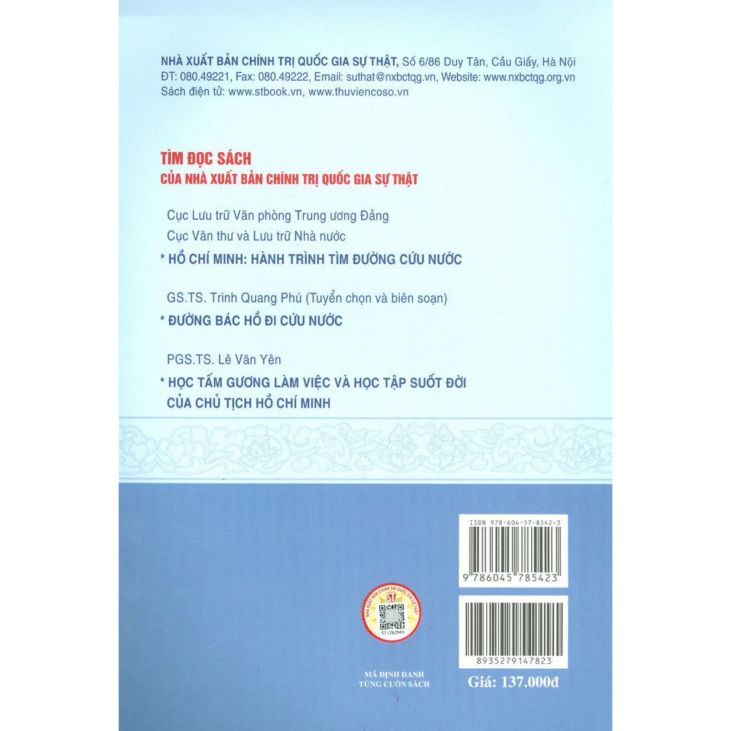 Sách - Hồ Chí Minh - Con Người Của Lịch Sử Và Làm Nên Lịch Sử Tác giả Đỗ Hoàng Linh Nhà xuất bản NXB Chính trị quốc gia Sự thật Đơn vị phát hành NXB Chính trị quốc gia Sự thật Ngày xuất bản 03-2023 Số trang 312 Kích thước 14.5 x 20.5 cm Loại bìa Bìa mềm Nội dung Cuốn sách trình bày một cách hệ thống những diễn biến lịch sử, những sự kiện quan trọng trong quá trình tìm đường cứu nước, giải phóng dân tộc và đấu tranh thống nhất Tổ quốc của Chủ tịch Hồ Chí Minh từ năm 1911 đến năm 1969. Nội dung cuốn sách cập nhật những tài liệu mới nhất đã được xác minh về quãng đời hoạt động cách mạng sôi động của Bác