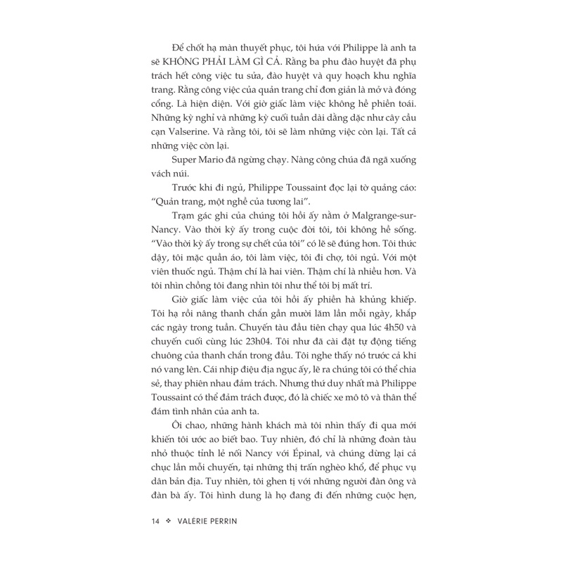 Tác giả: Valérie Perrin Nhà xuất bản: Hà Nội Số trang: 532 Kích thước: 15.5 x 24cm Ngày phát hành: 11-2020 Nhà phát hành: Nhã Nam “Một tiểu thuyết đầy cảm xúc, một cuốn sách đưa ta đi từ tiếng cười đến những giọt nước mắt với các nhân vật hài hước và cuốn hút.” – Ban giám khảo giải thưởng Prix des Maisons de la Presse.