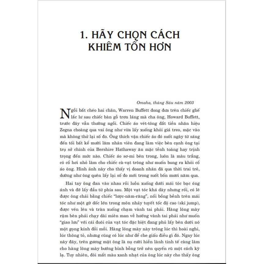 Warren đứng dậy khỏi bàn làm việc và sải bước ngang phòng như để đánh thức dòng hồi tưởng. Rồi ông an tọa trong chiếc ghế bành bọc gấm viền những sợi kim tuyến vàng óng, nghiêng người về phía trước trông giống như một cậu học trò nhỏ đang tự hào kể về mối tình đầu đẹp đẽ của mình hơn là một nhà tư bản tài chính lừng lẫy thế giới bảy-mươi-hai-tuổi. Câu chuyện sẽ được diễn giải như thế nào, tôi cần phải phỏng vấn những ai, bao nhiêu người và sẽ viết gì đây? Warren nói rằng tất cả đều do tôi quyết định.