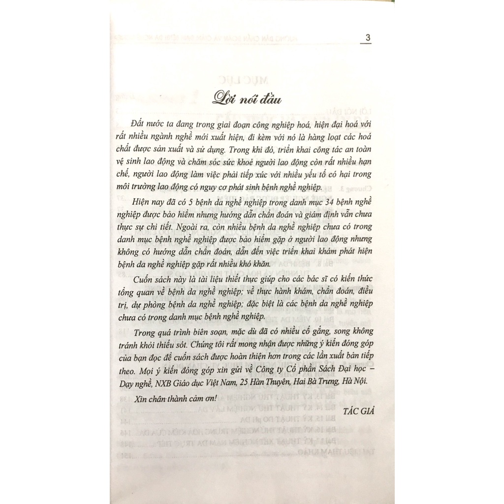 Nội dung : Đất nước ta đang trong giai đoạn công nghiệp hoá, hiện đại hoá với rất nhiều ngành nghề mới xuất hiện, đi kèm với nó là hàng loạt các hoá chất được sản xuất và sử dụng. Trong khi đó, triển khai công tác an toàn vệ sinh lao động và chăm sóc sức khoẻ người lao động còn rất nhiều hạn chế, người lao động làm việc phải tiếp xúc với nhiều yếu tố có hại trong môi trường lao động có nguy cơ phát sinh bệnh nghề nghiệp. TE Hiện nay đã có 5 bệnh da nghề nghiệp trong danh mục 34 bệnh nghề nghiệp được bảo hiểm nhưng hướng dẫn chẩn đoán và giám định vẫn chưa nhiều bệnh thực sự chi tiết. Ngoài ra, còn nhiều bệnh da nghề nghiệp chưa có trong danh mục bệnh nghề nghiệp được bảo hiểm gặp ở người lao động nhưng không có hướng dẫn chẩn đoán, dẫn đến việc triển khai khám phát hiện bệnh da nghề nghiệp gặp rất nhiều khó khăn. Cuốn sách này là tài liệu thiết thực giúp cho các bác sĩ có kiến thức tổng quan về bệnh da nghề nghiệp; về thực hành khám, chẩn đoán, điều trị, dự phòng bệnh da nghề nghiệp; đặc biệt là các bệnh da nghề nghiệp chưa có trong danh mục bệnh nghề nghiệp. Trong quá trình biên soạn, mặc dù đã có nhiều cố gắng, song không tránh khỏi thiếu sót. Chúng tôi rất mong nhận được những ý kiến đóng góp của bạn đọc để cuốn sách được hoàn thiện hơn trong các lần xuất bản tiếp theo. Mọi ý kiến đóng góp xin gửi về Công ty Cổ phần Sách Đại học – - Dạy nghề, NXB Giáo dục Việt Nam, 25 Hàn Thuyên, Hai Bà Trưng, Hà Nội.