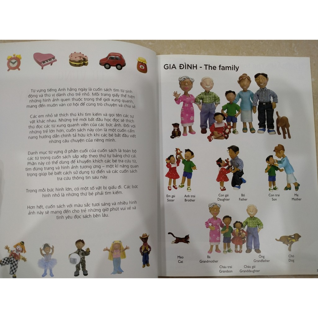 THÔNG TIN CHI TIẾT Công ty phát hành Quang Van Books Ngày xuất bản 11-2018 Kích thước 21.6 x 27.6 cm Tác giả ; Nhiều tác giả Số trang 51 Loại bìa Bìa mềm Nhà xb :NXB Phụ Nữ Giới thiệu sách : Bộ học liệu tiếng Anh chuẩn Usborne UK gồm 5 ấn phẩm được phân chia theo mức độ từ dễ đến khó theo số lượng và loại từ vựng. Các từ vựng được chia theo chủ đề cùng hình ảnh minh họa sinh động (được tạo hình nhân tạo bằng đất sét) giúp trẻ nhận thức thế giới thông qua hình ảnh, cùng hình dán sticker giúp trẻ tương tác và rèn luyện sự khéo léo của đôi bàn tay. Từ vựng trong các ấn phẩm này được chia theo chủ đề như con vật, nhà cửa, công viên, phương tiện... tất cả đều thân thuộc với trẻ giúp trẻ ghi nhớ nhanh chóng và dễ dàng ứng dụng. Ngoài ra những từ vựng trong cuốn sách này có tính kế thừa giúp trẻ ghi nhớ lâu hơn. Bộ học liệu tiếng Anh được Usborne UK soạn thảo theo khung chương trình đọc của Usborne. Tác giả của những cuốn sách này đã có nhiều kinh nghiệm trong việc nghiên cứu, biên soạn từ điển. Felicity Brooks là tác giả tiêu biểu đã sáng tác và biên tập hàng trăm cuốn sách cho thiếu nhi bao gồm từ điển, ngôn ngữ, truyện ngắn, những cuốn sách về lịch sử, địa lý, khoa học, toán học, thiên nhiên và nghệ thuật. Những cuốn sách đã được nhận giải thưởng TES Senior Information Book Award, Aventis Science Books Prize, SLA Information Book Award, Sheffield baby Books Award, Practical Pre-school Gold and Silver Awards. Level 4: Từ Vựng Tiếng Anh Hằng Ngày - Everyday Words In English Là một cuốn sách tìm từ sinh động và thú vị dành cho trẻ nhỏ với hơn 500 từ đơn giản. Đối với trẻ nhỏ mới bắt đầu học đọc, cuốn sách này sẽ giúp trẻ an tâm và vui vẻ thực hạnh nhận diện hình ảnh và từ ngữ. Các em nhỏ sẽ thích thú tìm kiếm và gọi tên các vật quen thuộc. Cuốn sách này cũng là cuốn cẩm mang hữu ích và dễ sử dụng giúp xây dựng vốn từ vựng và kiểm tra chính tả dành cho những ai đang học tiếng Anh.