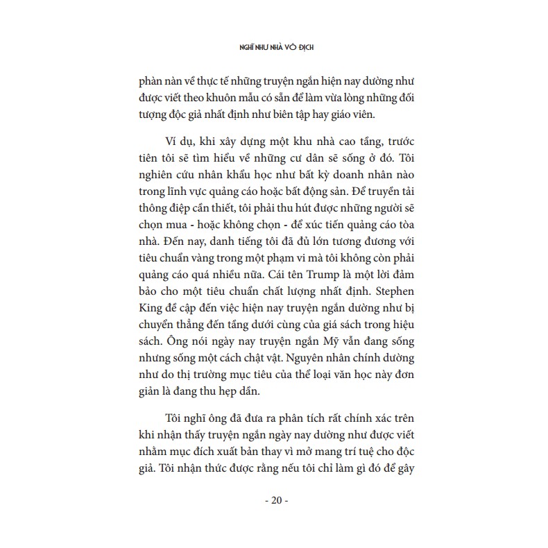“Trí tuệ của Donald là vô giá - đây là một cuốn sách hoàn hảo ra đời trong thời khắc tuyệt vời”. Robert Kiyosaki – Tác giả bộ sách Dạy con làm giàu Donald Trump là tác giả của nhiều cuốn sách được độc giả toàn thế giới yêu thích, ông cũng viết những đoạn luận ngắn thể hiện quan điểm của mình về các phương pháp hướng tới thành công trong sự nghiệp và cuộc sống. Ông đã lựa chọn những ghi chép tâm đắc nhất để đưa vào cuốn sách Think like a champion – Nghĩ như nhà vô địch, với kỳ vọng cuốn sách sẽ trở thành tài liệu tham khảo về thành công trong kinh doanh và cuộc sống dành tặng độc giả. Những trang sách ông viết không chỉ giàu thông tin, mang tính giáo dục cao mà còn giúp độc giả nhận thấy tư tưởng và trái tim cởi mở của một doanh nhân thành đạt và phi thường.