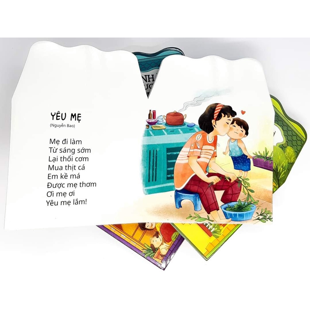 Nay cứ mê mẩn mãi bộ bìa cứng này. thú thật là bán sách mà không có sách mới giới thiệu đến mọi người cũng....áp lực phết. Thật ra thì hằng ngày có tỉ tỉ cuốn sách ra lò của đủ NXB nhưng không phải cuốn naof cũng vừa hay vừa đẹp như này. Cầm sách trên tay đến mình còn thích nữa là trẻ con. Toàn những bài thơ quen thuộc cho các bạn nhỏ tuổi mẫu giáo, minh hoạ long lanh siêu cu te hột me, lại còn bìa cứng hình ngôi nhà tha hồ nghịch mà không lo rách nữa :)