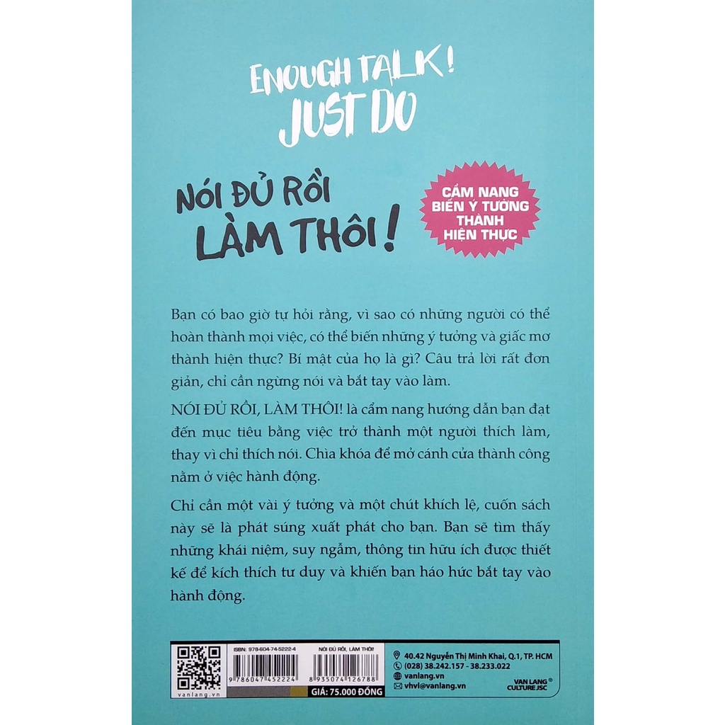 Nói Đủ Rồi Làm Thôi ! - Cẩm Nang Biến Ý Tưởng Thành Hiện Thực Bạn có bao giờ tự hỏi rằng, vì sao có những người có thể hoàn thành mọi việc, có thể biến những ý tưởng và giấc mơ thành hiện thực? Bí mật của họ là gì? Câu trả lời rất đơn giản, chỉ cần ngừng nói và bắt tay vào làm. Nói đủ rồi, làm thôi! là cẩm nang hướng dẫn bạn đạt đến mục tiêu bằng việc trở thành một người thích làm, thay vì chỉ thích nói. Chìa khóa để mở cánh cửa thành công nằm ở việc hành động. Chỉ cần một vài ý tưởng và một chút khích lệ, cuốn sách này sẽ là phát súng xuất phát cho bạn. Bạn sẽ tìm thấy những khái niệm, suy ngẫm, thông tin hữu ích được thiết kế để kích thích tư duy và khiến bạn háo hức bắt tay vào hành động.