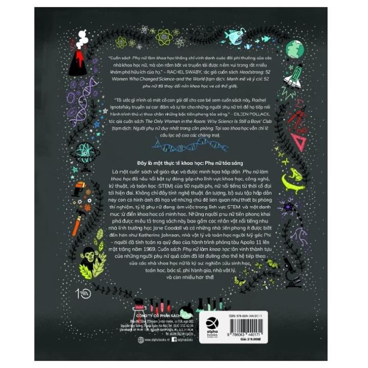 Là một cuốn sách về giáo dục và được minh họa hấp dẫn, “Phụ Nữ Làm Khoa Học” đã nêu nổi bật sự đóng góp cho lĩnh vực khoa học, công nghệ, kỹ thuật, và toán học (STEM) của 50 người phụ nữ nổi tiếng từ thời cổ đại tới hiện đại. Không chỉ mang đầy tính nghệ thuật, ấn tượng, bộ sưu tập hấp dẫn này còn có hình ảnh đồ họa về những chủ đề liên quan như thiết bị phòng thí nghiệm, tỷ lệ phụ nữ đang làm việc trong lĩnh vực STEM, và một danh mục từ điển khoa học có minh họa. Những người phụ nữ tiên phong khai phá được miêu tả trong sách này bao gồm các nhân vật nổi tiếng như nhà linh trưởng học Jane Goodall và cả những nhà tiên phong ít được biết đến hơn như Katherine Johnson, nhà vật lý và toán học người Mỹ gốc Phi – người đã tính toán ra quỹ đạo của hành trình phóng tàu Apollo 11 lên mặt trăng năm 1969. Cuốn sách “Phụ Nữ Làm Khoa Học” tôn vinh thành tựu của những người phụ nữ quả cảm đã lát đường cho thế hệ tiếp theo của các nhà khoa học nữ là kỹ sư, bác sĩ, phi hành gia, nhà vật lý, và còn nhiều hơn thế!