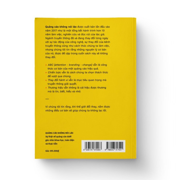 Dù là người mới bước vào ngành đang lạc lối giữa một rừng lý thuyết hay đã có nhiều kinh nghiệm chinh chiến lâu năm, “Quảng cáo không nói láo: sẽ dẫn dắt bạn khám phá thế giới quảng cáo dưới lăng kính khoa học thông qua 5 phần - 10 chương: quảng cáo, thương hiệu, chiến lược, ý tưởng, chuyện nghề.