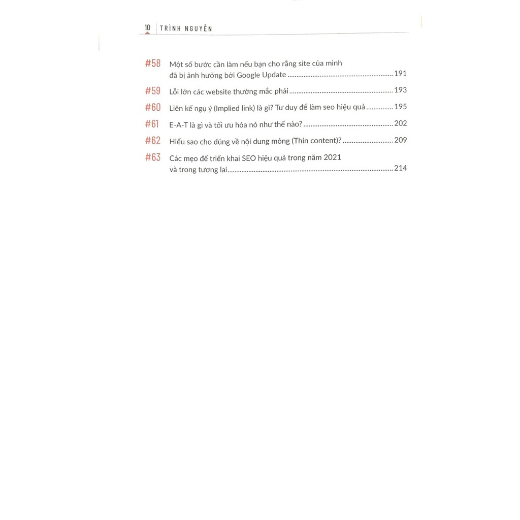 Trong SEO On-page trong tầm tay, tác giả Trình Nguyễn chia sẻ những gì anh đã đúc kết được sau nhiều năm làm việc, nghiên cứu và phát triển các giải pháp tối ưu hóa công cụ tìm kiếm nhằm giúp doanh nghiệp, những người làm SEO hiểu rõ hơn: