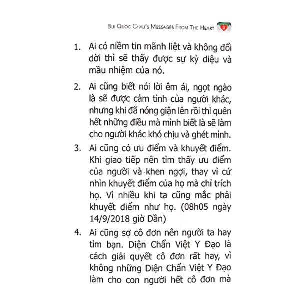 "Sự ra đời của cuốn sách tựa đề là tâm ngôn Bùi Quốc Châu. Tôi bắt đầu viết rải rác từ năm tôi 23 tuổi và cho đến tận hôm nay tôi gần 78 tuổi sách mới được xuất bản và chính thức ra mắt vào ngày 25/12/2018. Tập 1 gồm 2000 câu.