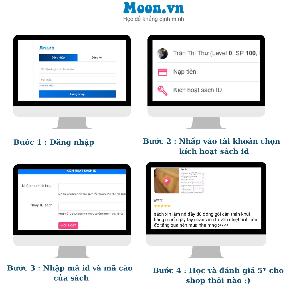 TIPS HỌC SÁCH ID MOONBOOK HIỆU QUẢ: Bước 1: Kích hoạt mã ID phía cuối cuốn sách Bước 2: Xem bài giảng lý thuyết trực tuyến đính kèm trên hệ thống qua mã ID Bước 3: Xem ví dụ và bài tập minh họa trong bài giảng Bước 4: Thực hành làm bài tập trong sách Bước 5: Tra cứu đáp án theo chuyên đề ngữ pháp hoặc từng câu hỏi. Để lại nhận xét nếu cần hỗ trợ giải đáp