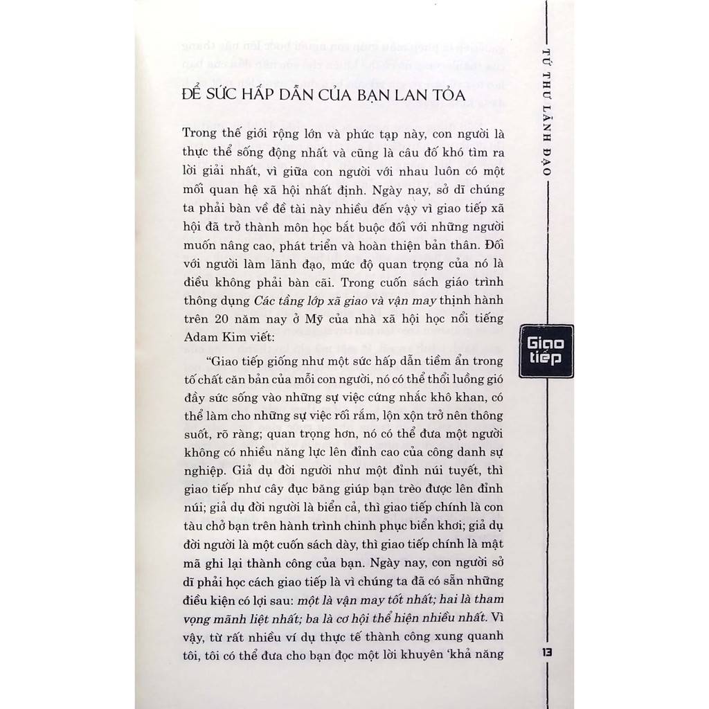 “Giao thiệp giống như một sức hấp dẫn tiềm ẩn trong tố chất căn bản của mỗi con người, nó có thể thổi luồng gió đầy sức sống vào những sự việc cứng nhắc khô khan, có thể làm cho những sự việc rối rắm lộn xộn trở nên thông suốt rõ ràng, quan trọng hơn nó có thể đưa một người không nhiều năng lực lên đỉnh cao của công danh sự nghiệp. Giả dụ đời người như một đỉnh núi tuyết, thì giao thiệp như cây đục băng giúp bạn trèo được lên đỉnh núi; giả dụ đời người là biển cả, thì giao thiệp chính là con tàu chở bạn trên hành trình chinh phục biển khơi; giả dụ đời người là một cuốn sách dày, thì giao thiệp chính là mật mã ghi lại thành công của bạn. Ngày nay, con người sở dĩ phải học cách giao thiệp, là bởi chúng ta đã có sẵn những điều kiện có lợi sau: một là vận may tốt nhất; hai là tham vọng mãnh liệt nhất; ba là cơ hội thể hiện nhiều nhất. Vì vậy, từ chính rất nhiều ví dụ thực tế thành công xung quanh tôi, tôi có thể đưa cho bạn đọc một lời khuyên là khả năng giao thiệp là phép màu giúp con người bước lên nấc thang của thành công, nó có thể khiến cho sức hấp dẫn của bạn lan tỏa vô tận và giá trị của bạn được nâng lên một cách đáng kinh ngạc ”.